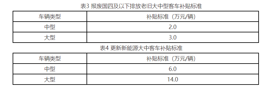 二、国四及以下排放标准老旧大中型客车报废更新为新能源客车报废国四及以下排放标准老旧大中型客车并更新新能源客车方可领取补贴。报废国四及以下排放老旧大中型客车并更新新能源客车补贴=报废国四及以下排放老旧客车补贴+更新新能源客车补贴其中,报废国四及以下排放老旧大中型客车补贴标准见表3,更新新能源客车补贴标准见表4。1.针对报废更新为新能源车的,可报废或更新多辆车,对于报废车辆数和更新车辆数不一致的情况,以报废或更新的车辆数量下限为准。即报废数量大于更新数量的,以更新车辆数为准给予补贴;报废数量小于更新数量的,以报废车辆数为准给予补贴。