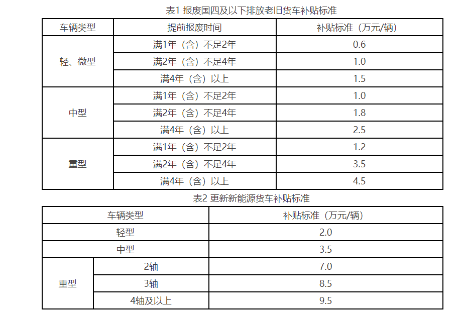 其中,报废国四及以下排放老旧货车补贴标准见表1,更新新能源货车补贴标准见表2。