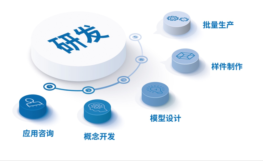 我们经验丰富的研发团队帮助客户从应用咨询、概念开发、模型设计、样件制作,到批量生产,提供量身定制的一站式解决方案。