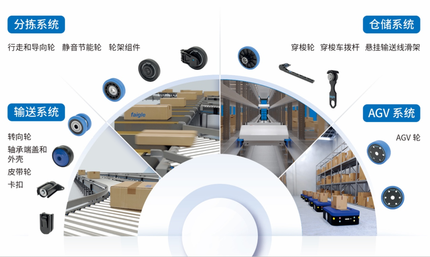 飞格立为全球各地的包裹和行李分拣系统、输送系统以及仓储系统的设备制造商开发和生产热塑性滚轮和组件。每天约两亿件包裹经飞格立滚轮高效流转;每刻近百万吨货物由飞格立滚轮持续运输,其出色的耐磨性、高强度、减震性和耐水解等优势,赢得了国内外众多客户的信赖与长期合作,在行业内树立了良好的口碑,飞格立致力于为全球客户提供优质的工程塑料解决方案,推动行业的发展与进步。